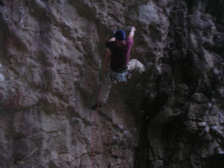 場に2:00頃到着。センターズ先発隊のテントに転がり 込み、就寝。 さあ、1日目。 12を触れる程トレーニングはしてないので、「オーバー・ドライブ」 に狙いを絞る。オンサイトを、出来るはずがないので、ヌンチャク掛けを アップとする。出だし悪い! 各駅停車の状態でどうにか上まで抜けた。久しぶりの岩に、このルートは きつく、まったく出来る気がしない。 岩のフリクションは良く、指の皮がなくなるので、ハングドックは 最小限に抑えたいところ。。。 そうこうしてる間に、ゴンさんはジャンバラヤをRPした。 おめでとうございま~す 1抜け。2回目。 案外ムーブが出来て、意外と1テンで抜けた。 シバ太君もスーパースターをレッド 2抜け。ダイダイさんをそそのかし、オーバー・ドライブへ引きずり込む。 3回目。 結構落とす気満々で飛びつくが、核心入り口で失敗! というか、もうホールドが持てない・・・ 持久系ルートで持久力がない。絶望的な現実。 とにかくムーブを固める。 あ○きさんは、トゥエルブモンキーにトライ中。 ボルダームーブの連続だ。 ダイダイさんと交互にトライする。 4回目。 更に高度が下がり指が開く。 テンションかけまくりで、この日は終了。 隊長はジャンバラヤRP オーバー・ドライブをOS! 筆者です。オーバー・ドライブ 「宴」