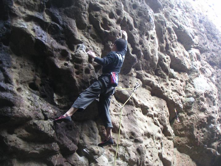 筋肉痛は更にひどくなり、スローパーが多いせいか、前腕の筋肉痛 が特にひどい。 怪しげなドリンクを貰っていた事を思い出し、出発前に飲んだ。 まずヌンチャク掛け。悪い出だしに苦戦する。それまでは落ちたことが なかったが、落ちまくる。スタートすらきれない体調。 一箇所足位置を変えると、少し安定したムーブになった。 1ピン。2ピン。上へ登るほど体が温まり、気持ちも乗ってきた。 地面の上でオブザベをすると、すべてのムーブが綺麗につなっがった。 行けるかもしれない。。。 ただ一箇所、クリップのタイミングに迷う部分がある。 サイドのポケットでクリップするか(ムーブの途中になるが、ホールド は割と良い)、それとも核心終了のホールドまで我慢するか(腰クリップ になり少し怖い)。 2回目。 核心手前で気持ちを高め突っ込む。 1手。2手。と確実に高度を稼ぎ、サイドポケットでクリップ。 残りは3手。デッドであまいホールドに飛びつき押さえ込む。 思わず声がでるも、次のムーブまで手が持たず落ちた。 残りの3手まで力を残すには、核心の13手を一気にやってしまう しかない。クリップは最後だ! ダイダイさんも密かにRPを狙っている様だ。 3回目。 時間的にも最後になるだろう。 「やってやる」という気持ちがあるにもかかわらず、あまり緊張感はなく、心は落ち着いている。とても不思議な感覚だった。 核心手前で一息吐き、突っ込む。 今度は一気に上まで・・・ 1手2手・・・いつも苦労したキョンのムーブで声がでる。 しかしスムーズにこなし、少し手を振る余裕もあった。 最後の3手。左手をデッドであまいホールドに飛ばし押さえつける。 わずかだが力が残っている。 迷わず右手を出し、次のムーブに移り、体を上げ左手をガバへ 伸ばす。 掴んだ!すかさずクリップし一息つく。 核心は越えたが、まだ先は長い。垂直以下だがいやらしい壁 が待っている。 気を抜くことは許されない。 慎重かつ大胆に登りきり、ボクの城山は終わった。 トゥエルブモンキーにトライ中あ○きさん オーバードライブトライ中ゴンさん
