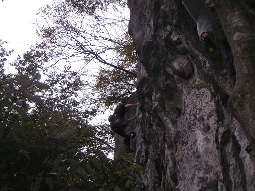 行くチャン、ダイダイさん、IKUさん、T氏。 このメンバーで芹谷へ行ってきた。 ハングルーズは順番待ちの様で、小屏風へ移動し ショートバージョンでアップ。 ボーイズマインドは人気だったので、また大屏風にもどり、 コーヒーなんぞを沸かしのんびりする。 さてさてと思い、ブロークンフィンガーを触ってみた。 2ぴん目までヌンチャクをかけるが、3ピン目をかけれない。 ムーブもよく分からず、ホールドも悪い。 さらにトラバース気味で、落ちたら振られてグランドしそう な高さで怖い。(結局、落ちて、振られて岩に激突したが。グランドはセーフ。) 骨折り男のボルトも使い、スリングも使い とにかく上まで上がる。(骨折り男は出来ないと思った) 上部はガバガバだったが、ヒーヒー言いながらどうにか終了点へ たどり着くことが出来た。 ブロークンフィンガー恐るべし。指皮もブロークンされるし。 全然のんびりじゃなくなってしまった。 エスニックを登るIKUさん。 着実にルートを落としていきます。