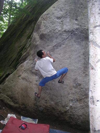 高原のソフトクリーム(宇宙で日本イチ!!)を食べたり(噂どおり 美味しかった)滝沢牧場で偶然見つけた、楽焼(焼き物のカップに塗絵をして焼いてもらう)の体験をして、楽しんだ。 昼過ぎのんびりと石川へ向かう。 今日は少々天気が怪しかろうが、粘るつもりだ。 やはり人が多い。1階でアップをやろうと思い、ソナチネの 順番待ちを聞く。4人待ち。 まあ、待つかと待っているとワイワイと人がやってきて、 「ブラックシープは何人待ちか?」と尋ねる。 「ん??」である。 これがブラックシープと言う事は、昨日のルートはなに?? トポをよく見ると、「ジョコンダ10d」となっていた。 ああ勘違い。というやつである。 気をとりなおし、登る。 恐ろしい。9+のプラスは精神的な怖さの分か? トップロープ状態にし、行くチャンも登る。 怖がっていたが、トップロープオンサイト?だった。 足使いや、岩を見る目が上手くなった。 2階へ。 BUN2は2人待ち。 ボクの前にやっていた人は苦労していて、11bより難しいといっていた。 ムーブは固まった様だが、時間切れでヌンチャクを回収していった。 しかたなくヌンチャクをかけに行き、核心ムーブを固めた。 3回目のトライで無事レッド出来た。 兄岩の方へサカエ君とコデら氏を探しに行くが見つからず、 がんばれ熊さんに落とされ、テン場に戻った。 今日はコデら氏が夕食係だ。 コデら氏の友達も加わりワイワイ食べた。 朝食を作っていると、聞き覚えのある笑い声が聞こえ、 振り向くと、コデら氏とサカエ君がやって来た。 「攀じるTシャツ」を着ていたので、一発でわかったらしい。 彼らとリバーサイドへ向かう。 リバーサイド2階は込んでいたので、一階へ。 一階も人気ルートは込んで、岩の状態も少し悪かったが、 ブラックシープはあいていたのでアップする。 登っていくと、急にホールドがなくなった。 4級?位のスラブになり何回か挑戦するが敗退。 懸垂で回収するはめになり、やる気をもがれた。 2階へあがると、コデら氏とサカエ君は「DOKUFU」 をやっていたので、一緒にやろうとするが、順番待ちが長すぎ。 丁度となりの「BUN2」があいたので、そっちをすることにした。 ハンドトラバースからクリップ。チョーク跡を触るがどれも悪い。 バランスも探るが結局落ちる。 少し粘ると割りとあっさり上まで抜けることが出来た。 狙いを絞るが、雨がポツポツでテン場まで戻ることにした。 不安定だが本降りにならず日の差すこともあるので、ボルダーへ。 コデら氏にクジラ岩へと案内してもらう。 そこには、普段ジムで見るセッションの光景があった。 ボルダー初心者にはきびしそうな課題ばかりなので、 10級?9級?位の課題から。スラブのワンムーブって感じだった。 行くチャンは何度もトライし、少しづつムーブを固め、 ついには先に行ってしまった。 次に6級をする。今度はフェイスのワンムーブ。 ムーブがわかりかけて来たときに手がすべり落ちる。 木に激突し、ついでに足もひねった。 やる気をなくし、買出しに行くことにした。 行くチャンが氷をもらってきてくれたので、冷やしながら向かう。 今晩はキムチ鍋。 |