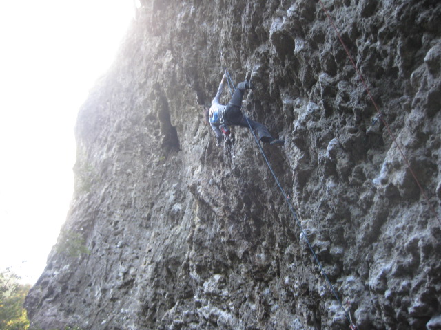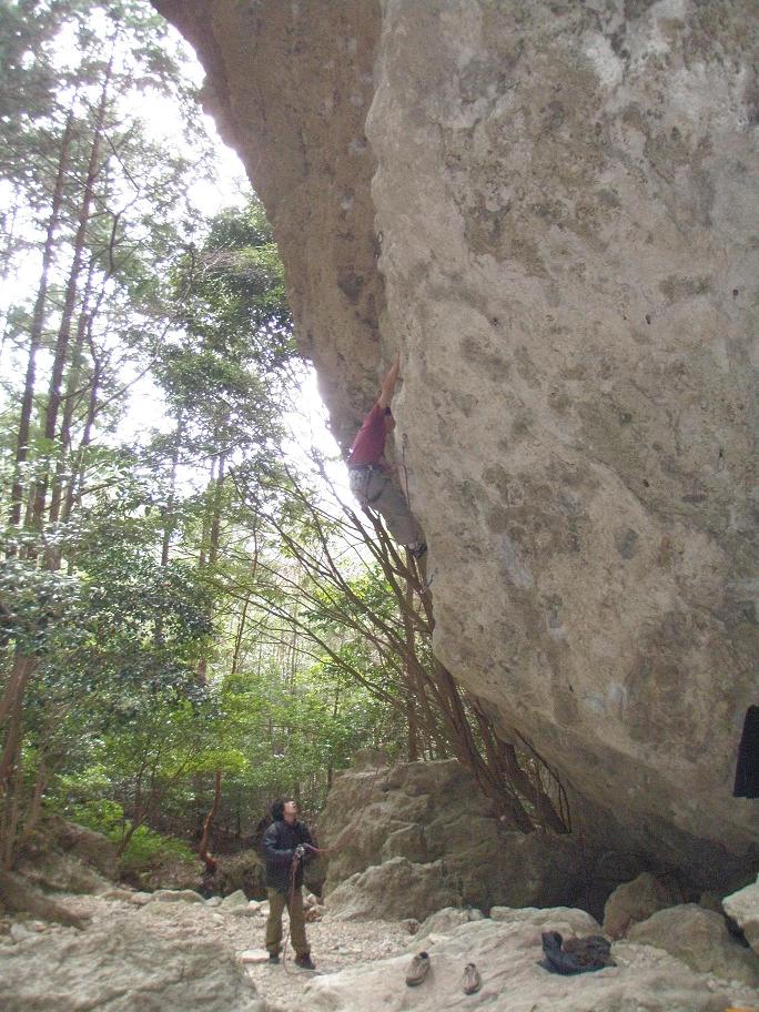 朝、リポDを飲んだおかげか、アプローチが いつもより早かった。 アップを済まし、FIRSTにヌンチャクを掛けた。 しばらく休んでやってみるが、傾斜がきつくなってしばらく のところで落ちてしまった。 しかし、この前より5手くらい進んだ。 今の所、一日2回と決めているので、FIRSTはおしまい。 メインの裏かべにある「マンモスくん」をやる。 最後のピンまで行ってヌンチャクが足りない。。。 と思ったが、予備のヌンチャクがハーネスの一番後ろ に掛かっていたので命拾い。 ピンの数は数えてから登りましょう。 最後にあんこを登ったらギリギリだった。 今日は、留年が熱い日だった。