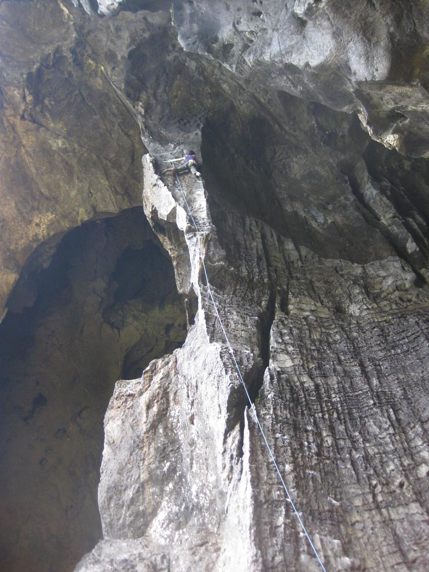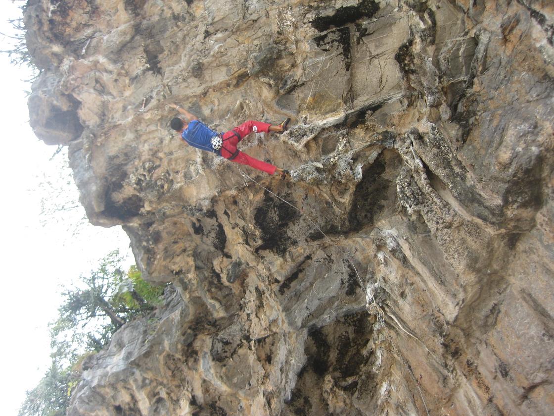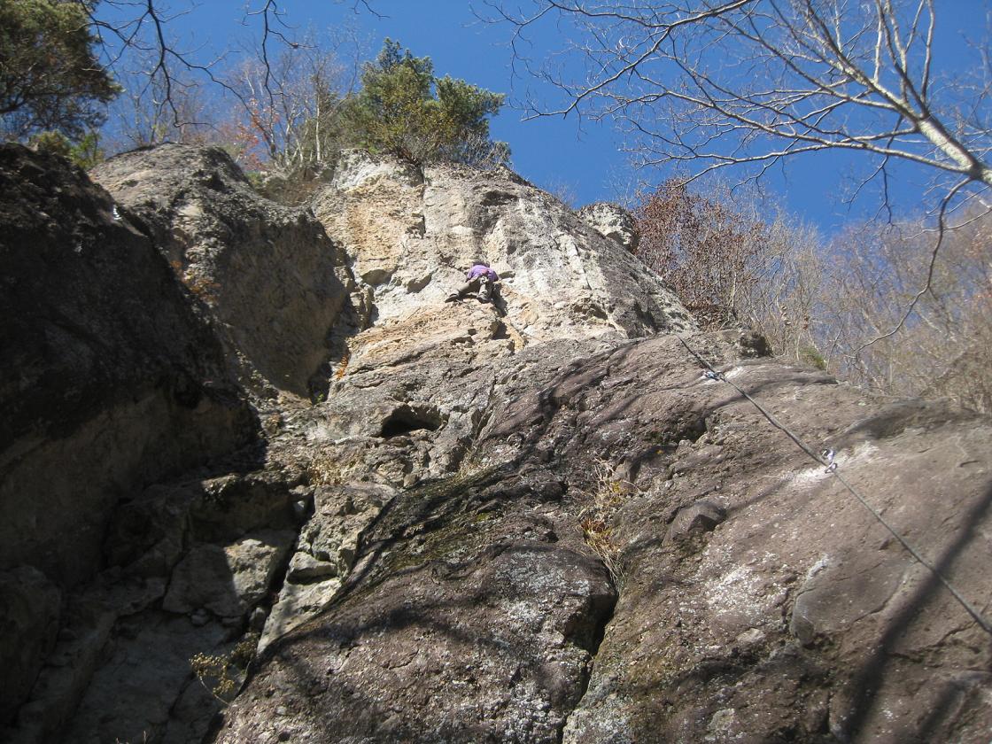 ということになり、行ってみた。 四星ルートの穴男がありますからね。 登山道をしばらく上がると烏帽子岩があった。 しかし穴男の岩はもう一段したにある様だ。 下る道を探すがなく、岩場を少し横切るとフィックスが あった。 その下はゆるいのスラブ状になっている。 もう一度トポをみると、もうひとつ道がありそうなので そっちへいく。 ここかな~?って所を上がると、U字状になった岩の 上にくさったロープがあった。 一人づつ、20m程上がるとまたロープがはってある。 今度は、ゆるいスラブ状にくさってさらにズタズタに 外皮の剥けたロープ。。 かなりびびりながら上がった。 穴男の岩はそこに見えるが、今度は沢になった場所を渡り 向こうへ行かなければならない。 向こうへ行っても、やぶと傾斜で危なそう。。。 で、やめた。 帰りは、ロープを出し懸垂。 時間が経ってしまったので、近場のひょうたんへ。 近いが、どれも難しいルート。 3人で、左上がりのダンディをやるが、なかなか 渋いルートでした。 ホールドは細かく、ピン間も離れ気味でさらに左上。 K君は2回目惜しかったが、RPならず。 で、この日はやる気も失せてしまっているので早々に 撤収。 長くやってればこんな日もあるよね。 な一日。 怪我がなくて良かった。。