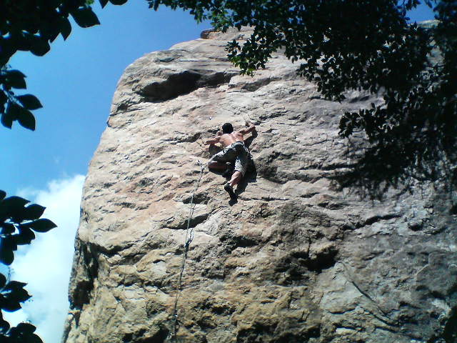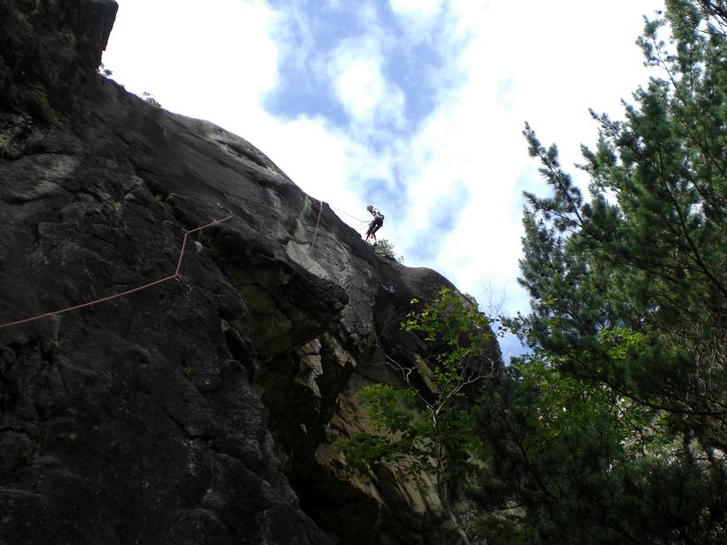 そしてオランジュ岩へ。 この壁は長くスッキリとしたルートがある。 はるな 2×。核心のムーブは繋がったが、指が終わったのと、左足をスメアリングして体を上げて行くのだが、ソールに穴が空いて、足が決まらなくなってしまったのでやめた。 ゆきんこさんとコメケンさんはあみだくじをやっていたので、ボクは姉御岩へ行った。 金のわらじ 1×。ハング部分キビシイです。 荷物をしまい、歩き出すと夕立が降ってきた。