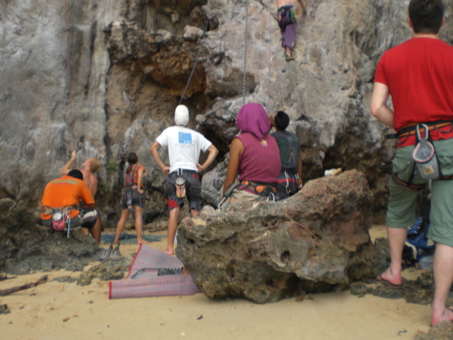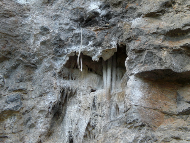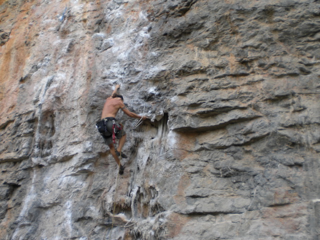 岩場に着くとかなりの染み出ししていて、ソロさんはデッドラインをRPしているのにメンテナンス(染み出すクラックにタオルを詰め、濡れたホールドをフキフキ)していた。 バイタルを狙っていたようだが、全部濡れていてこっちをやろうとしていた様だ。 アップするルートもなく、ソロさんが8Pまでヌンチャクを掛けたので、その先のヌンチャク掛けをアップがてらやろうと、デッドラインに取り付いた。 ホールドが濡れていて、落ちそうになったが、登って行くと欲が出てきて、そのまま突っ込んで行ったが、落ちた。 でも、最高到達点。 日もさし、壁も乾いて来た様だ。 じっくり休んで、もう一度やる。2P目で落ちた。 ここちょっと苦手… 続けて行く。 乾いて見えたホールドは、濡れていたが、一手だけだったので、我慢して抜けて行った。 とにかく、レストできる所はレストし、ムーブ中にも腕を振った。 10分程壁に張り付いていたのだろうか? ようやく、核心を越え、もう落ちないであろう地帯。異様に緊張し、心臓の音が聞こえそうだったが、無事に終了点クリップ。 ようやく終わった。 『デッドライン』ええルートです! |
